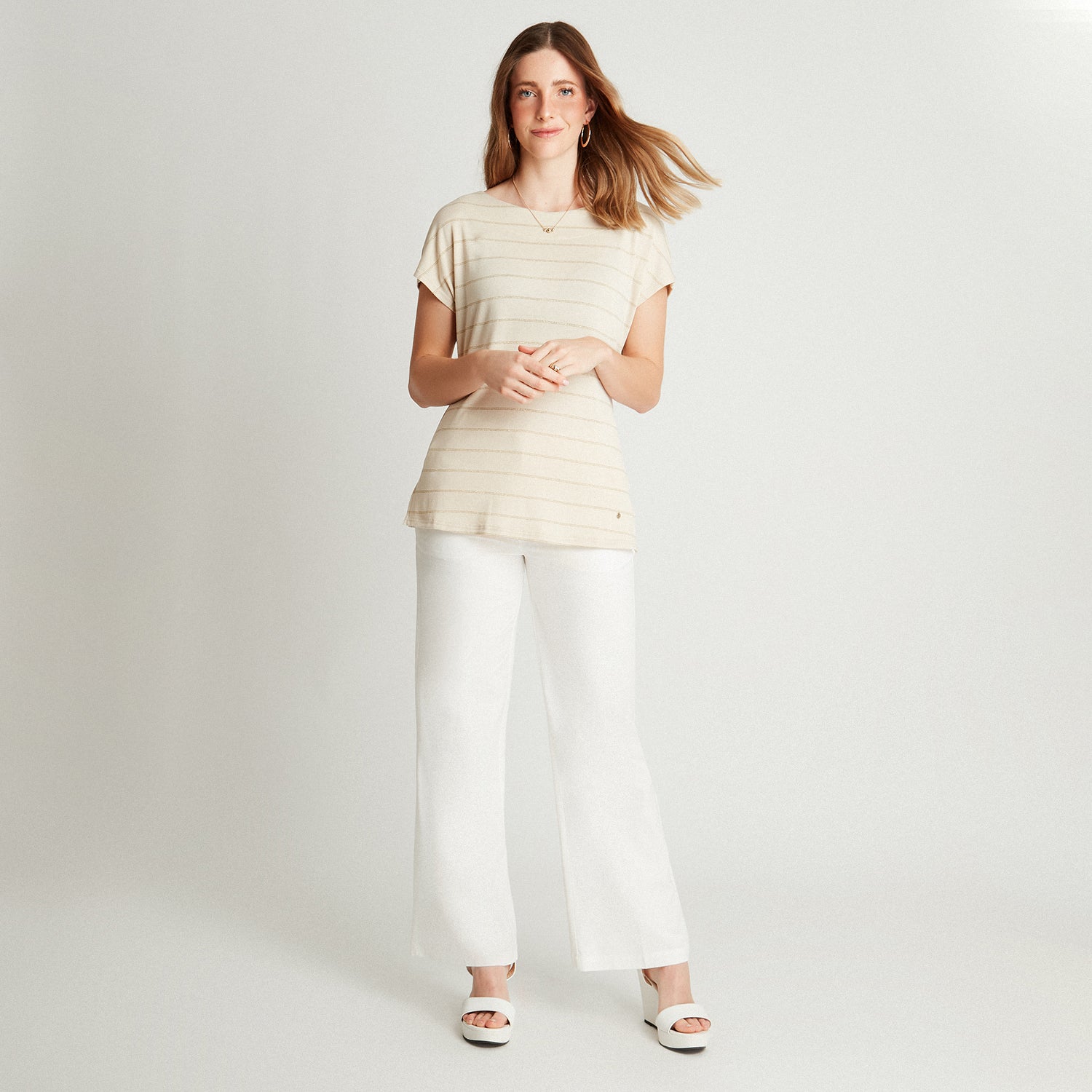 Polera Beige Manga Kimono Listada Cuello Redondo Lorenzo di Pontti Lorenzo di Pontti