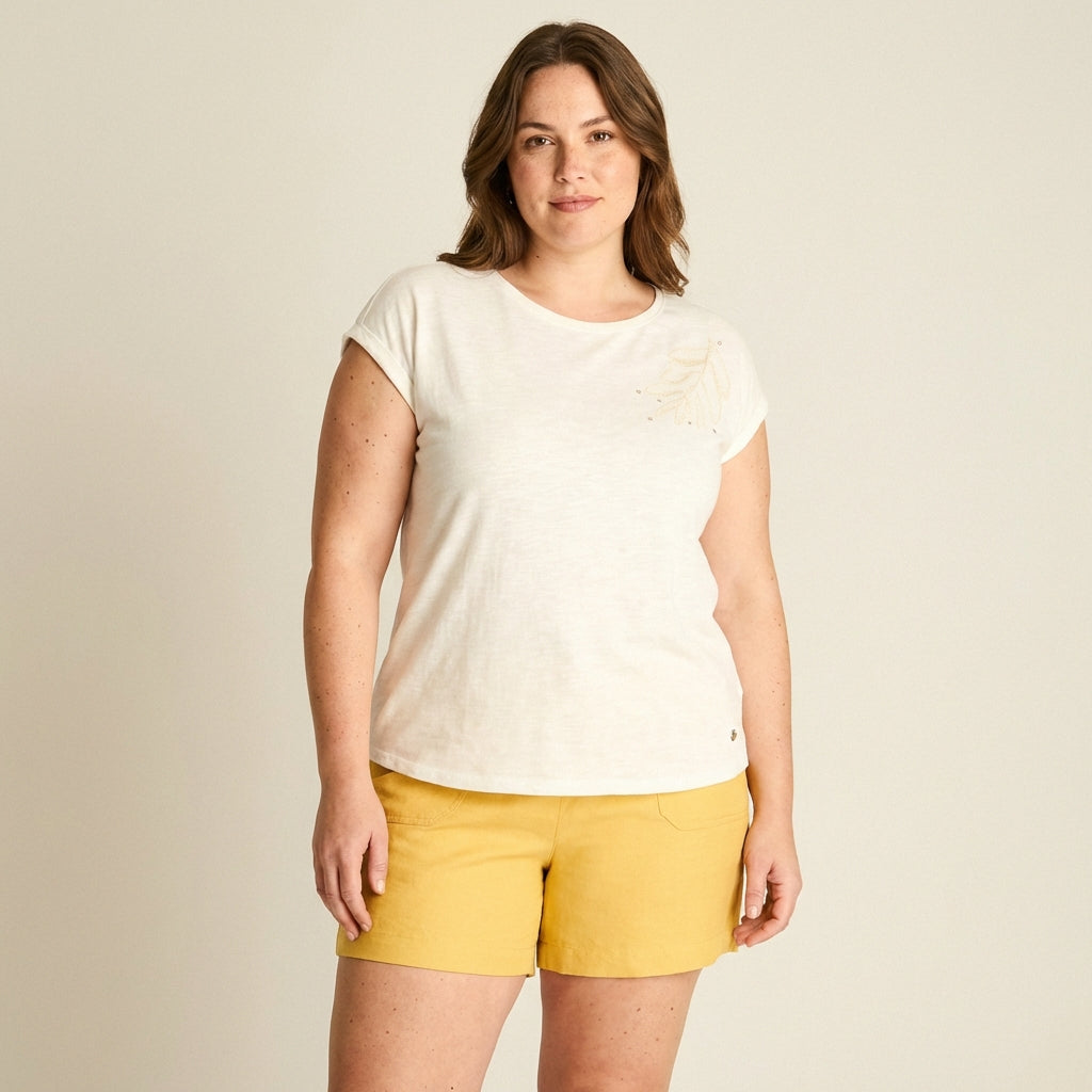 Una polera fresca y femenina para el día a día. Su color crudo y la delicada aplicación de bordado en el hombro la convierten en un básico con detalle especial, ideal para combinar con jeans, bermudas o pantalones fluidos en looks relajados, muy Weekend by Lorenzo di Pontti.