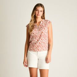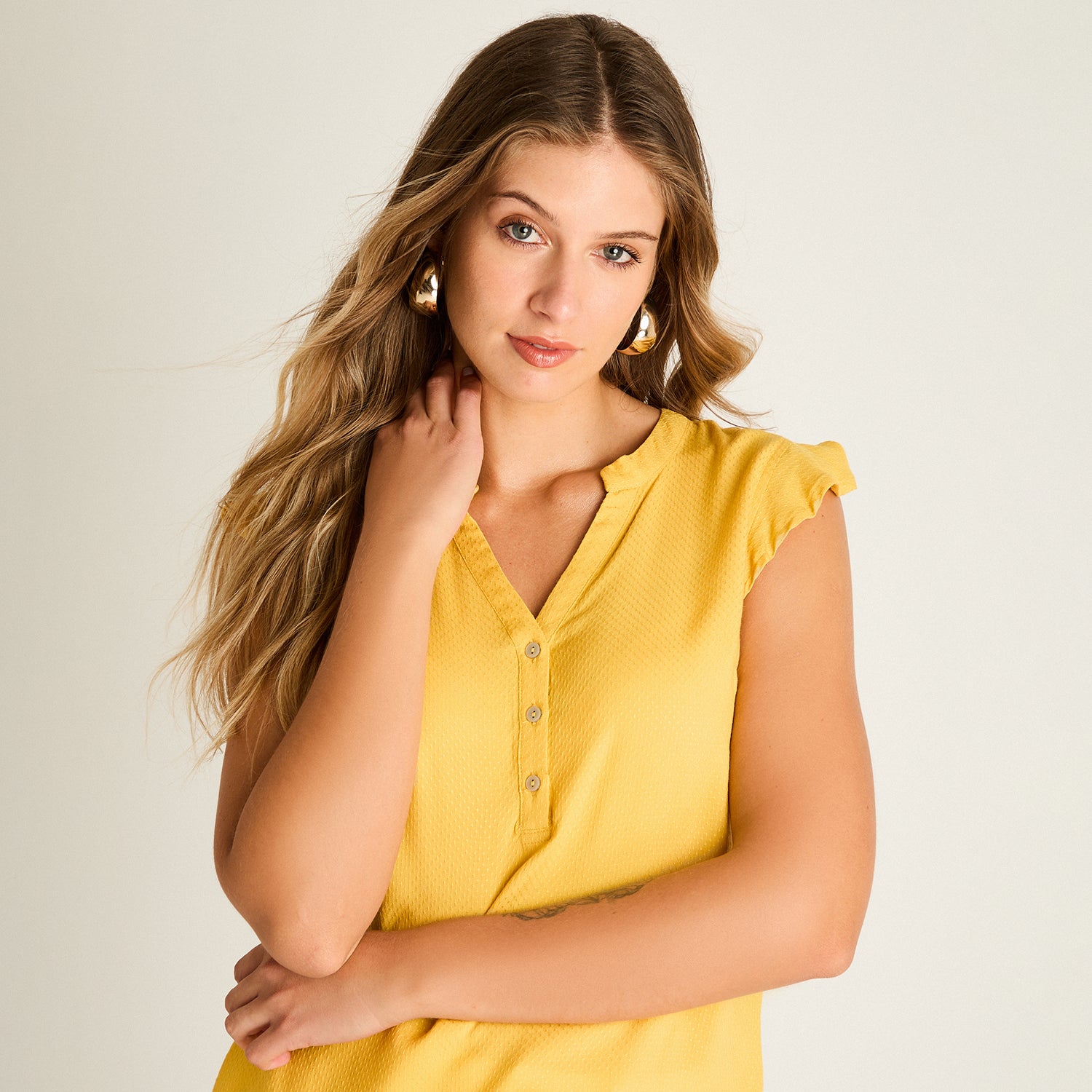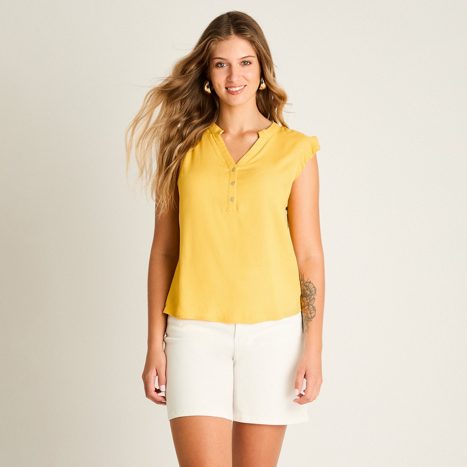 Frescura y estilo para tus días de verano. Esta blusa mostaza de manga corta está confeccionada en 100% viscosa, un tejido ligero y fluido que se adapta de manera natural al movimiento. Su diseño con cuello en V, botones delanteros y detalle sutil en las mangas la convierten en una prenda versátil, perfecta para usar tanto en looks casuales como más sofisticados.