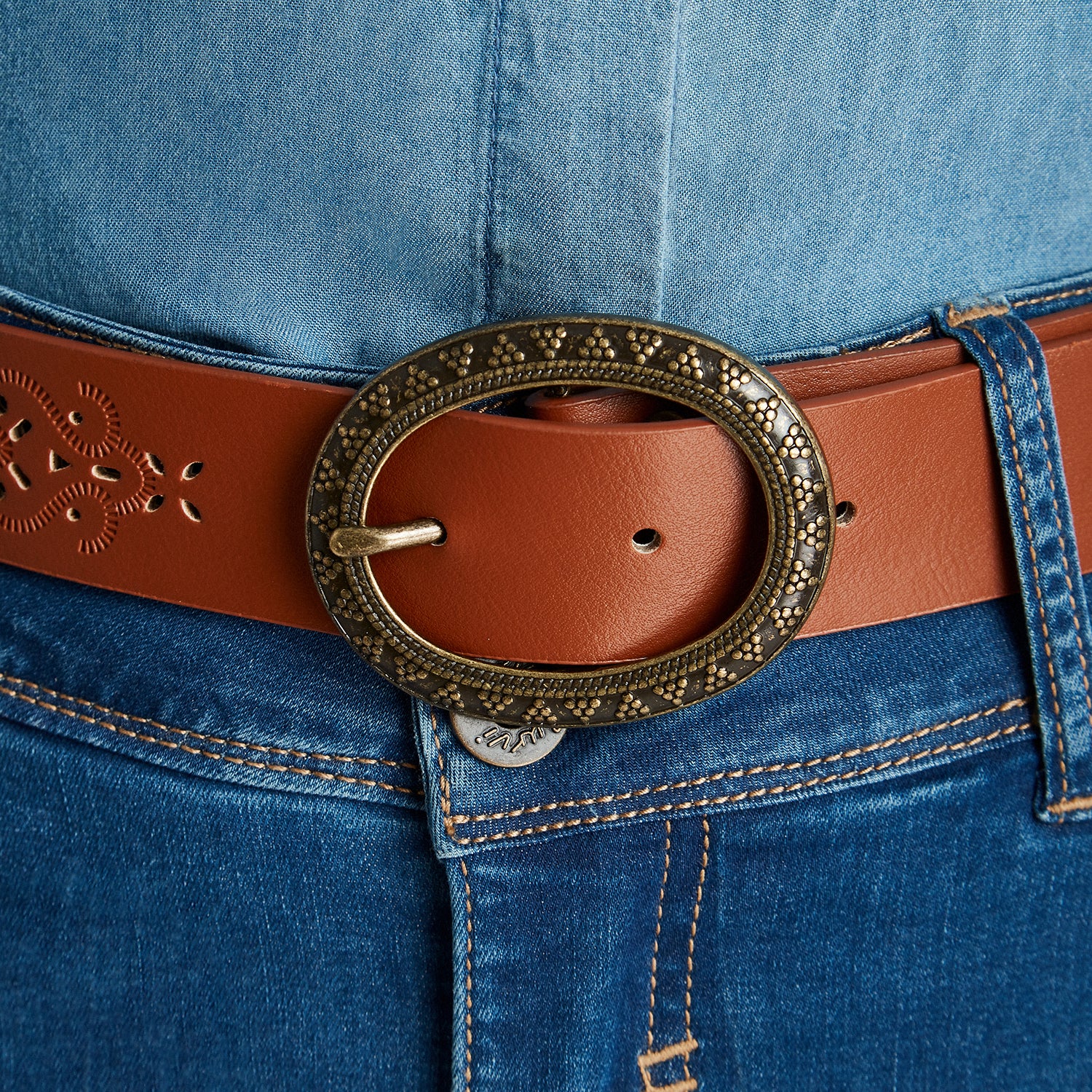 Este cinturón de Curvi es ideal para marcar la cintura y darle vida a tus outfits. Está confeccionado en 100% poliuretano y destaca por su hebilla metálica circular con diseño grabado, que aporta un aire artesanal y elegante. El calado tipo bordado láser sobre la cinta en color camel suma un toque especial que lo hace versátil y lleno de estilo. Perfecto para combinar con jeans, vestidos o faldas.