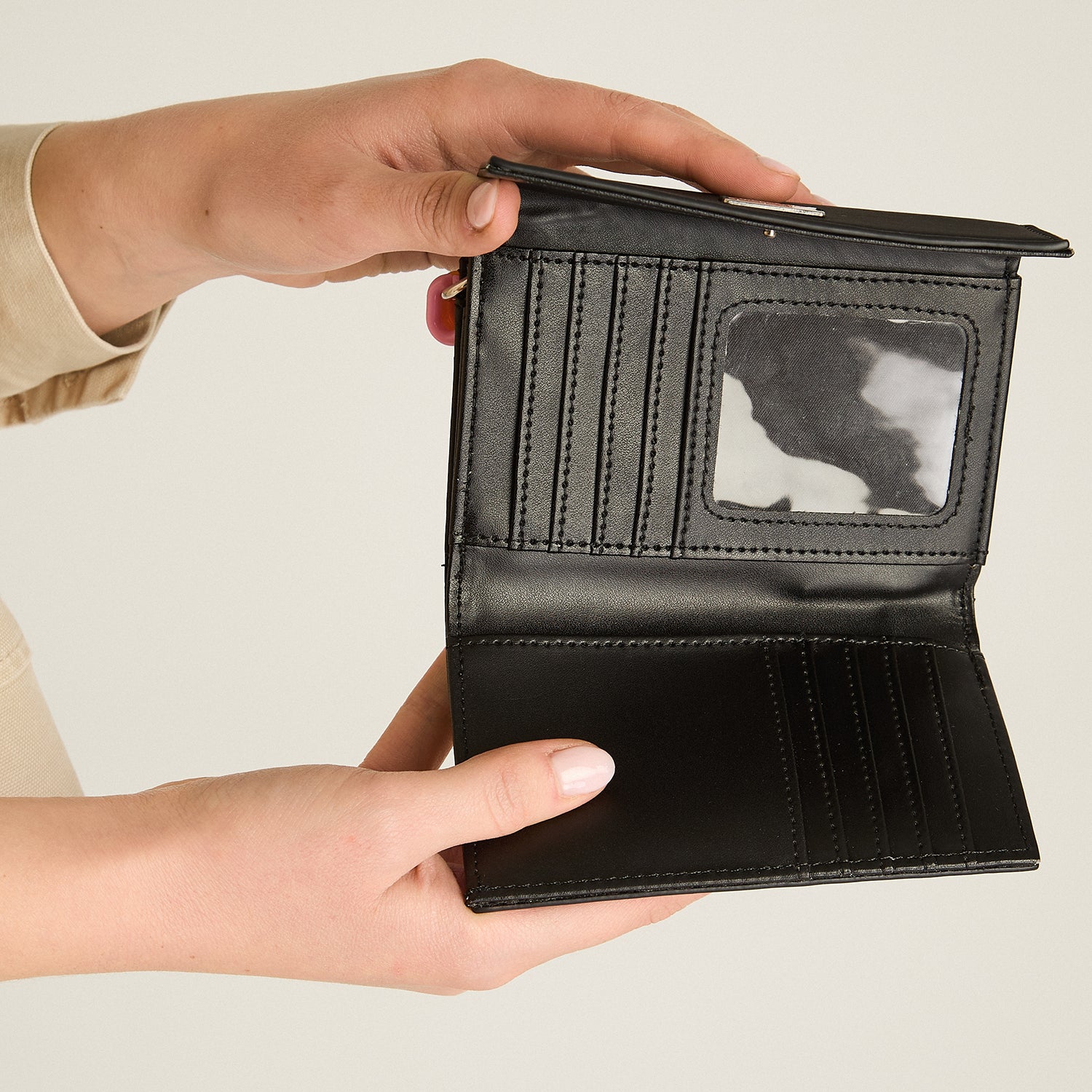 Billetera negra práctica y funcional, ideal para el uso diario. Su diseño compacto permite llevarla cómodamente en la cartera o en la mano, sin perder capacidad interior. Cuenta con cierre frontal con broche, múltiples ranuras para tarjetas, compartimento para billetes y ventana para identificación.