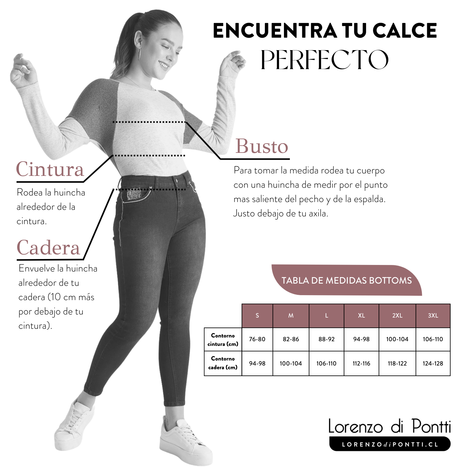Tip: La modelo mide 1.71mt de altura, 100 cm de cadera, 71cm de cintura y 88 cm de busto y está usando talla S/ 40