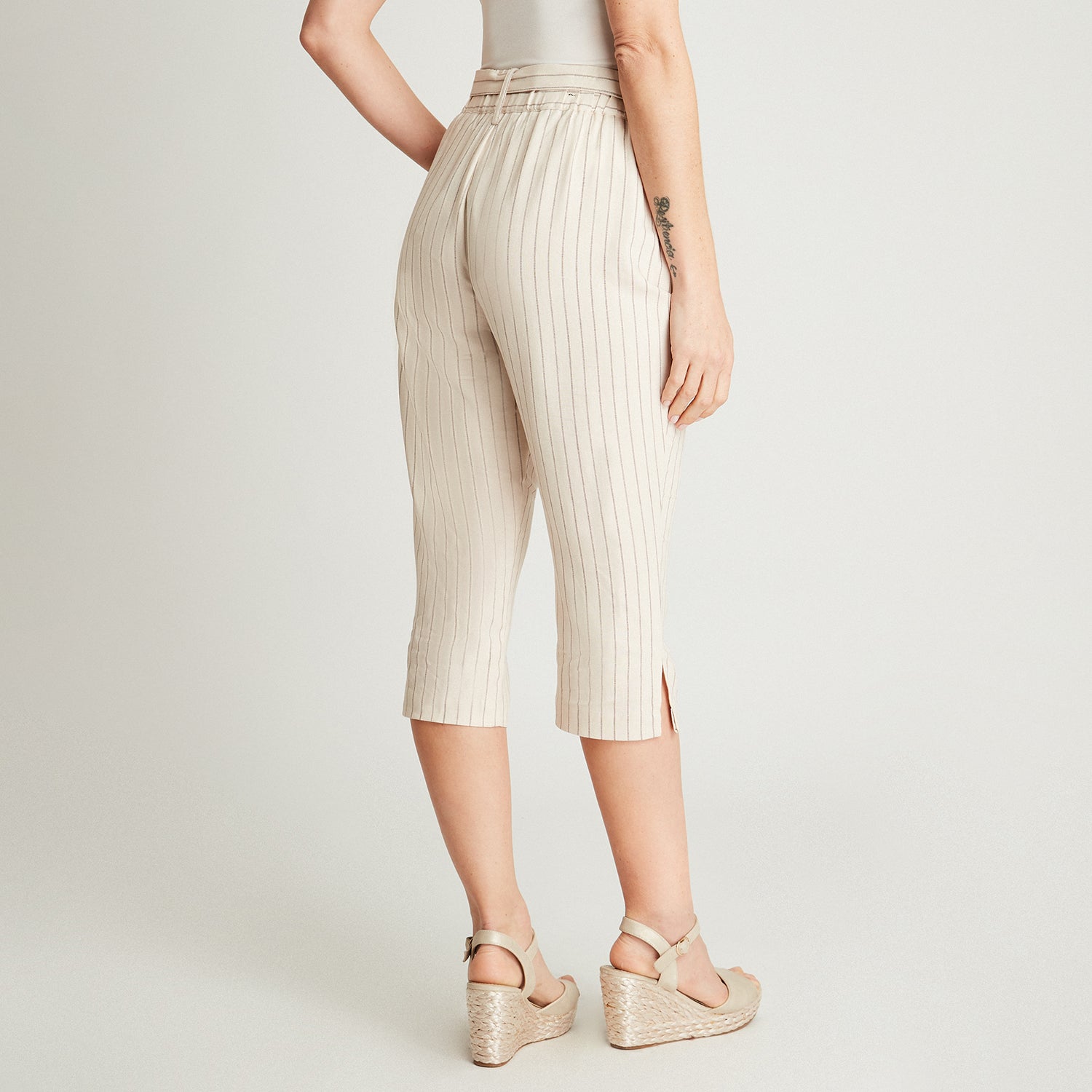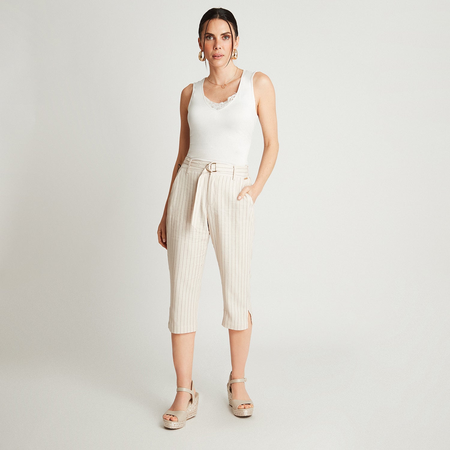 Este pantalón capri beige de tiro alto con lazo y bolsillos combina elegancia y frescura. Su corte recto y pinzas delanteras estilizan la figura sin perder comodidad. El tono neutro permite múltiples combinaciones y es ideal para looks casuales o más pulidos según los accesorios.