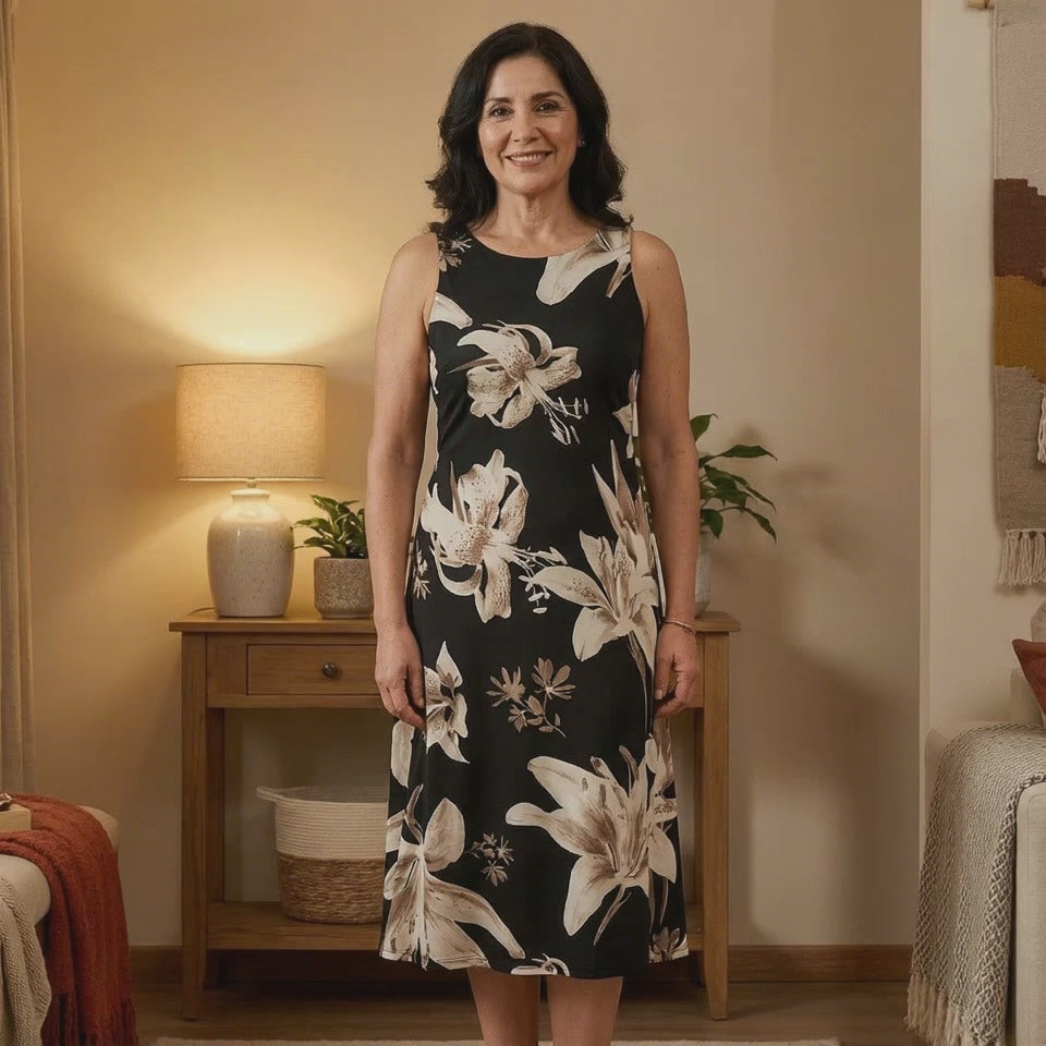 Este vestido maxi sin mangas es la elección perfecta para un look veraniego con presencia y frescura. Su calce normal y elasticidad media permiten que fluya con tu cuerpo, mientras el estampado floral lo convierte en un básico sofisticado.