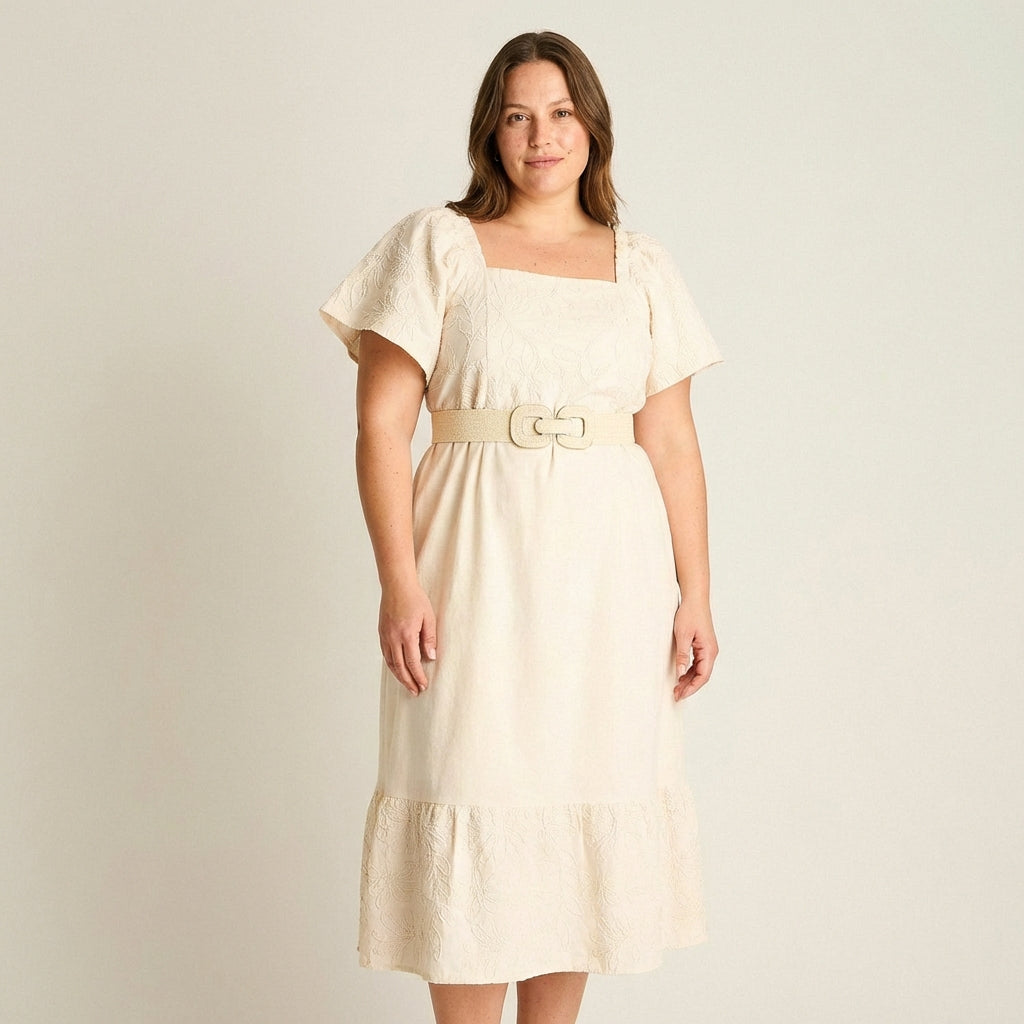 El escote cuadrado, las mangas amplias y la falda midi de caída suave dan movimiento sin ajustar. La mezcla de algodón y lino se siente ligera y cómoda, ideal para climas cálidos y looks versátiles de fin de semana.
