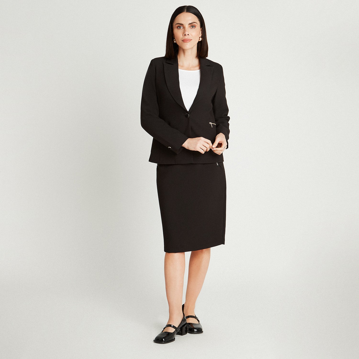 Este elegante blazer negro de manga larga es la combinación perfecta entre comodidad y profesionalismo. Confeccionado en una mezcla de poliéster, viscosa y elastano, brinda un ajuste cómodo y estructurado que resalta tu silueta con un aire moderno. El cuello con solapa y su diseño clásico lo convierten en una prenda esencial para cualquier ocasión, desde el trabajo hasta un evento formal.